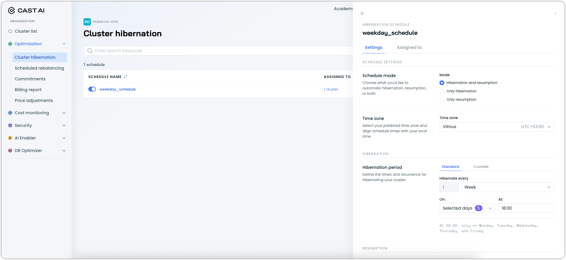- Console interface: Direct hibernation scheduling and management through the Cast AI console with intuitive configuration options