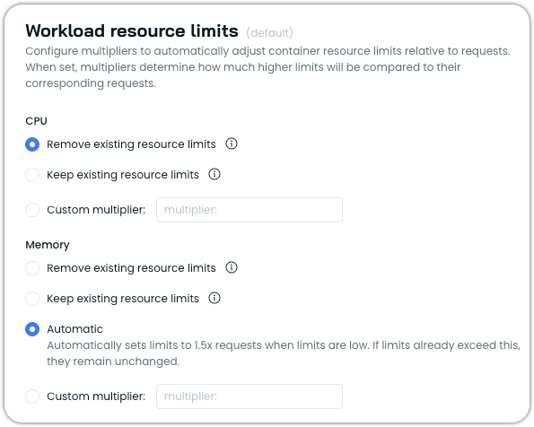 The Workload Autoscaler now offers flexible options for handling existing resource limits, including the ability to preserve current limit configurations. This addresses customer requirements to maintain the existing limits while still benefiting from resource request optimization.