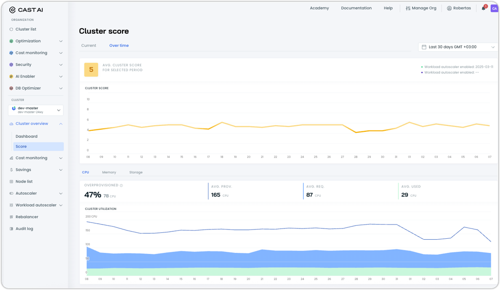 - Performance correlation: Correlate score changes with specific optimization actions like enabling Workload Autoscaler, configuring rebalancing schedules, or adjusting node templates