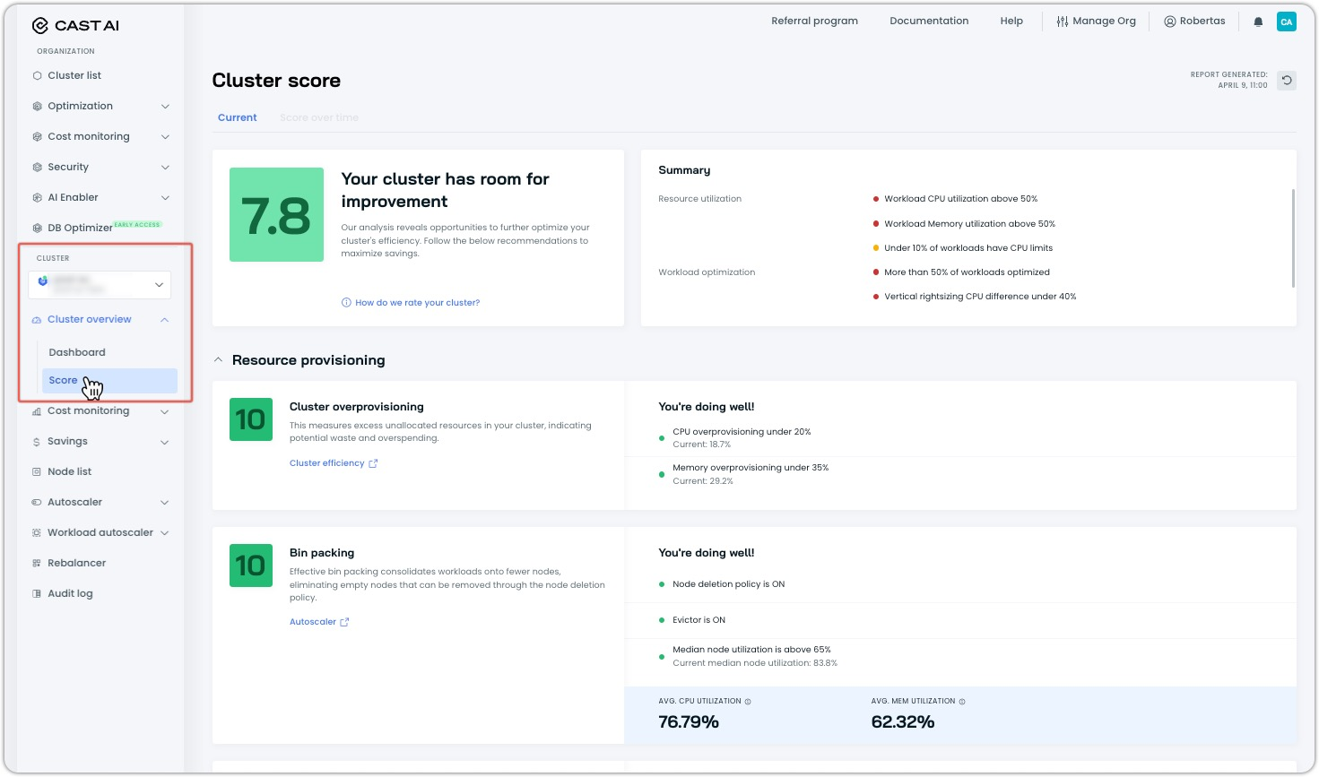 A new Cluster Score feature provides a comprehensive 0-10 rating that evaluates your cluster's optimization across multiple dimensions. Rather than focusing on single metrics, the score analyzes resource provisioning, workload efficiency, and rebalancing effectiveness to deliver actionable insights.