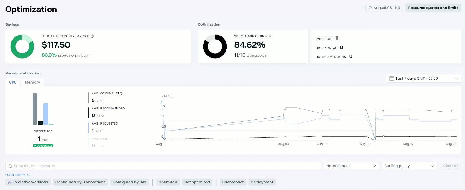 - Zero-downtime optimization: Resource requests can be adjusted without pod restarts, maintaining application availability during optimization