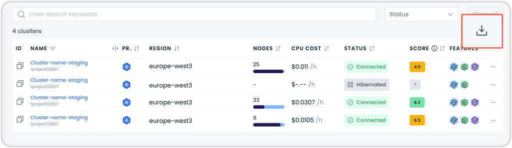 A new CSV export option allows you to download cluster list data directly from the console. The export includes all visible cluster metrics with clean formatting - measurement units in headers and bare values for easy analysis in external tools.