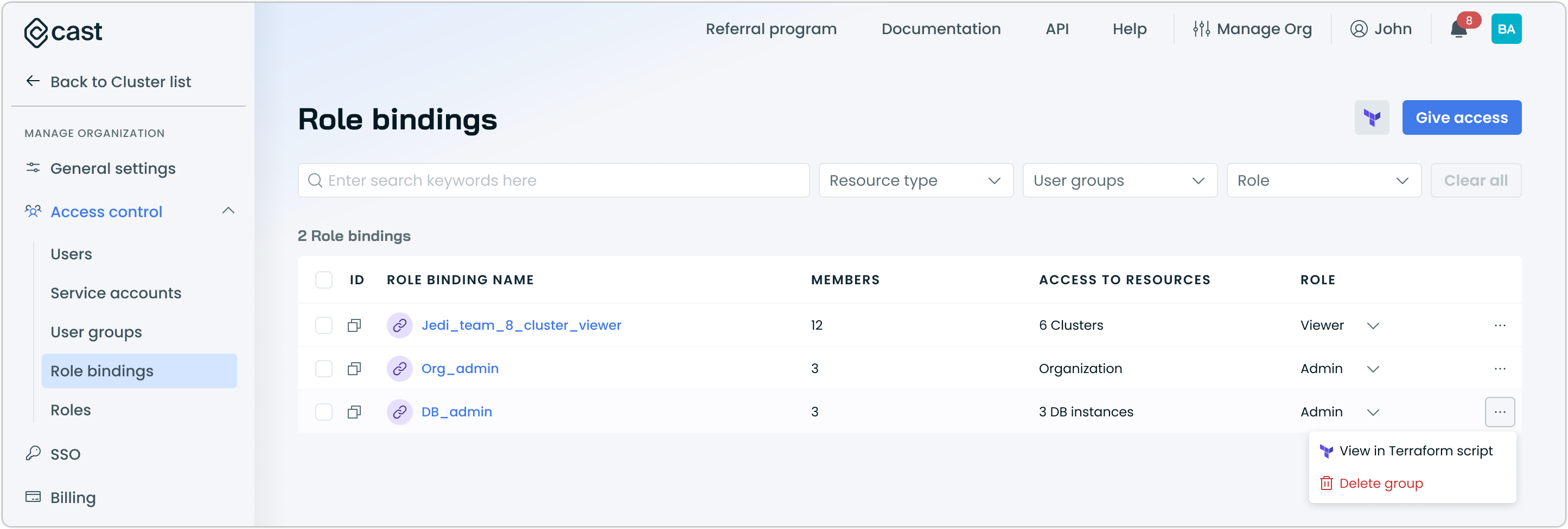 - Multi-interface support: Manage role bindings through the console interface, REST API, or Terraform provider for seamless integration with existing workflows