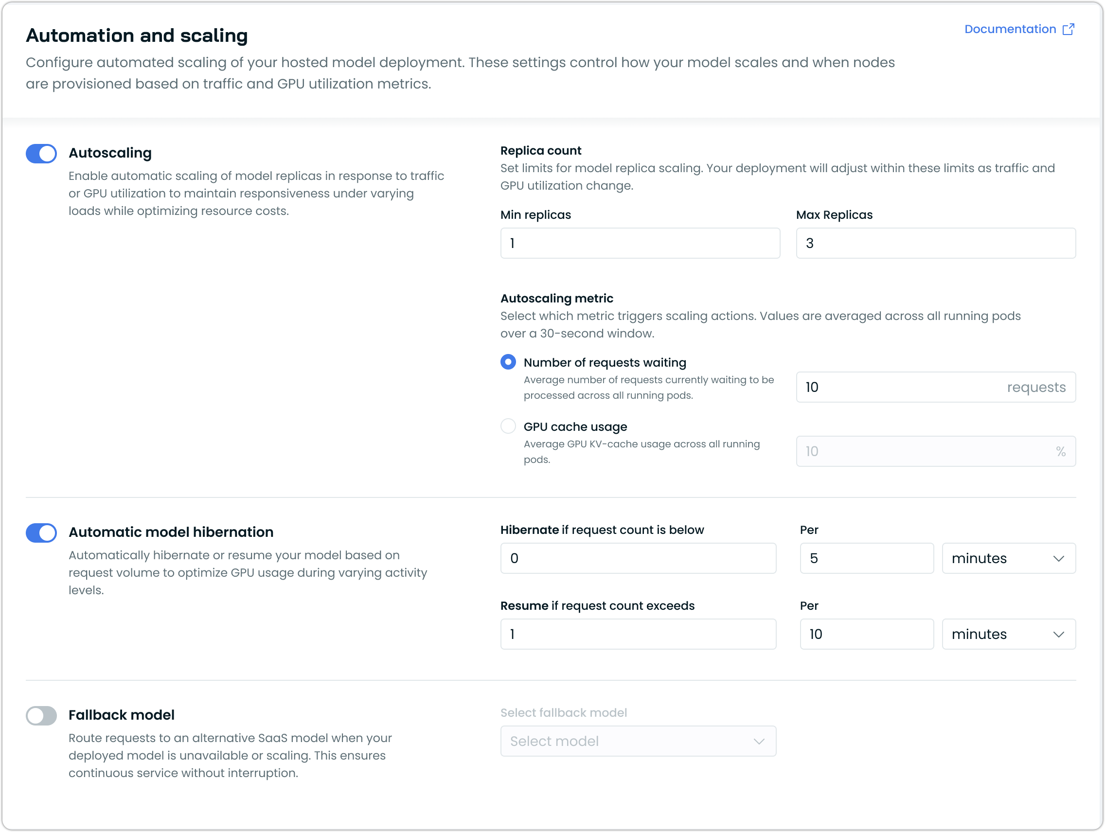 This functionality is accessible through both the model deployment interface and post-deployment configuration settings, allowing teams to optimize their self-hosted model infrastructure as needed.