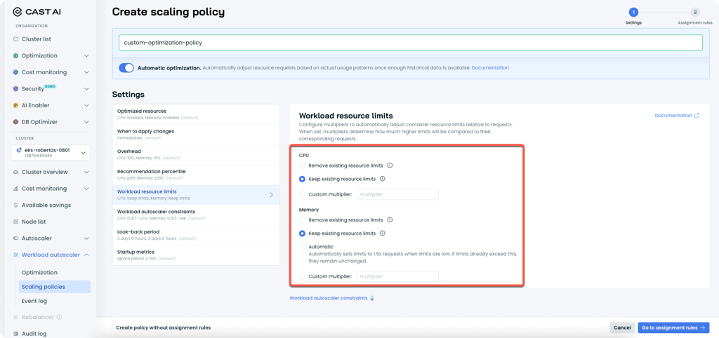 Workload resource limit settings now include a "Keep existing resource limits" option for both CPU and memory configurations. This setting preserves any existing resource limits defined in workload manifests while still allowing the Workload Autoscaler to optimize resource requests.