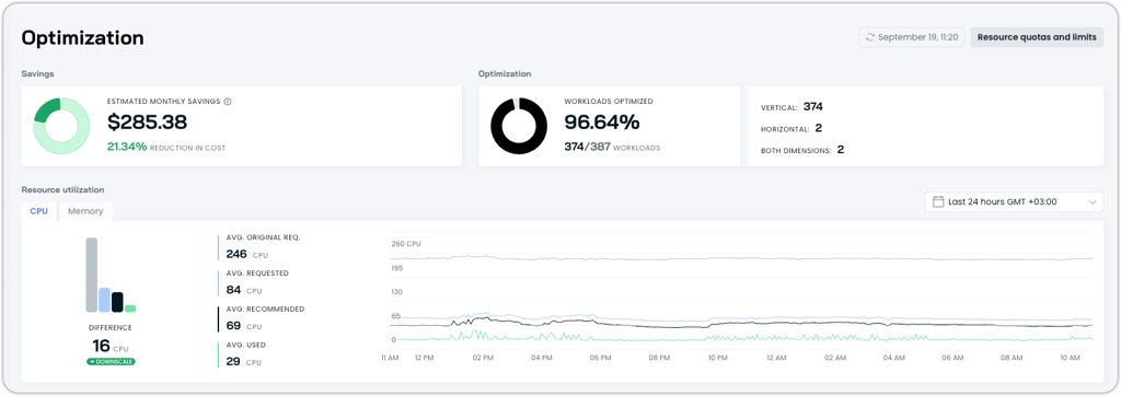 The Workload Autoscaler’s Optimization page now displays an improved resource summary section with visual enhancements for tracking CPU and memory optimization. The updated interface includes historical resource charts showing recommendations, requests, original requests, and actual usage data alongside summary bars displaying the latest metrics.