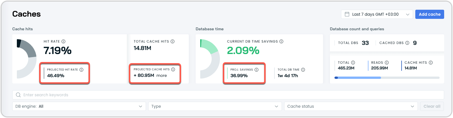 Passthrough mode was enhanced to calculate a projected cache hit rate, which is now available even before the cache is deployed. In addition, the system also estimates projected time savings. This data is available both per database and at the individual query level, allowing customers to gain deeper insights into which queries are considered cacheable and what savings enabling DBO would bring.