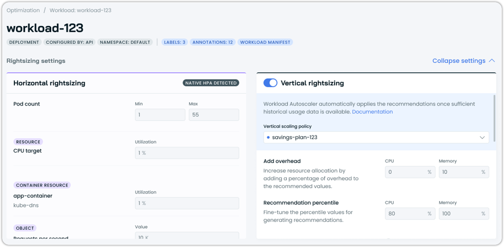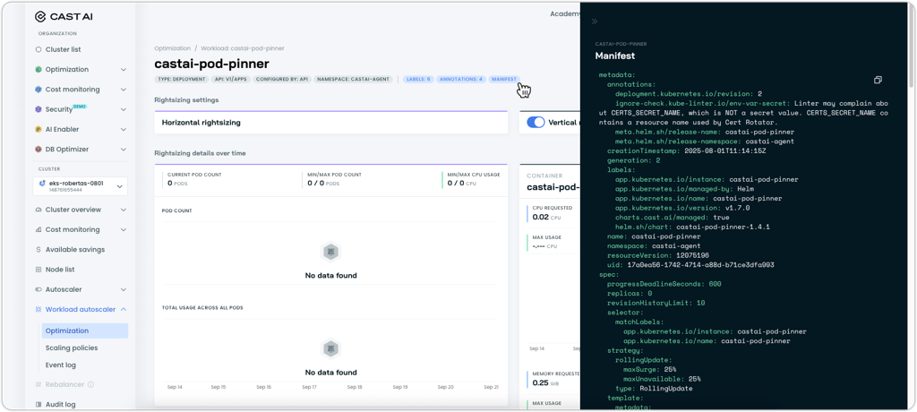 This provides visibility into existing HPA configurations without requiring users to check Kubernetes manifests separately, making it easier to understand and coordinate between native HPA policies and Cast AI's optimization recommendations, which are shown side-by-side.