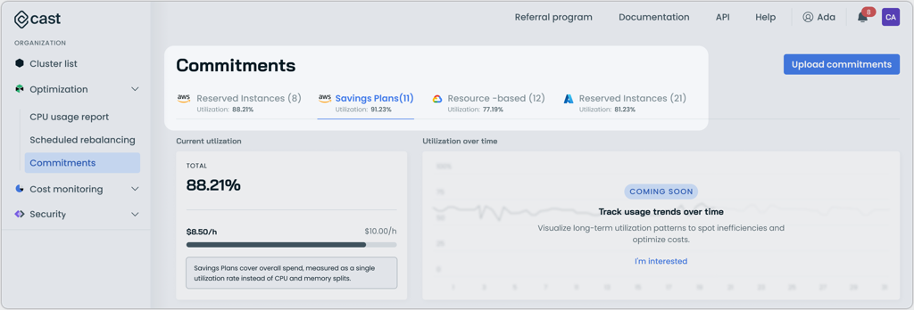 The Commitments page now features tabs that organize commitment types for easier navigation. The updated design separates Reserved Instances, Savings Plans, and Resource-based commitments into dedicated tabs, each displaying relevant utilization metrics and commitment details.