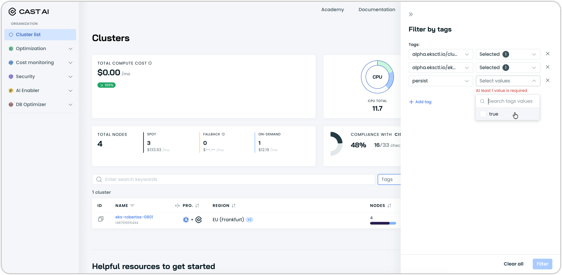 Clusters now display associated tags in both the cluster dashboard and cluster list views. Tags appear in a dedicated section on the cluster dashboard, with a drawer view available for clusters with multiple tags. The cluster list includes tag-based filtering, so users can quickly locate clusters by their assigned tags.