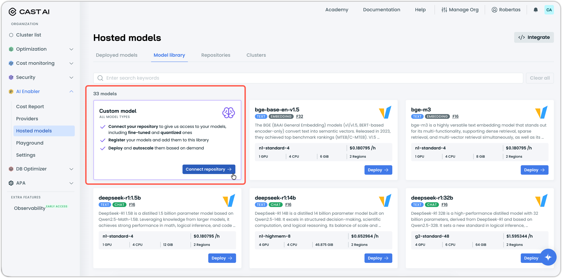 Custom models are automatically exposed as providers in the AI Enabler interface and appear in the model library with a custom model designation. Users can deploy these models directly from there using the same deployment workflow as pre-configured models.