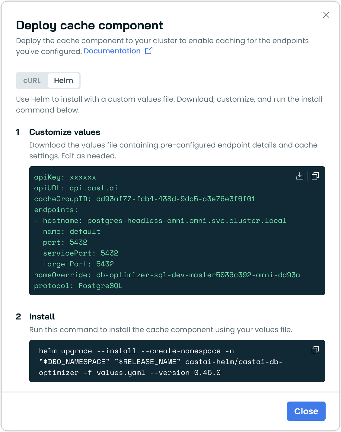 Database Optimizer cache deployment now supports Helm-based installation through downloadable values files. Users can download a pre-configured values file containing endpoint details and cache settings, customize it as needed, and install the cache component using Helm.