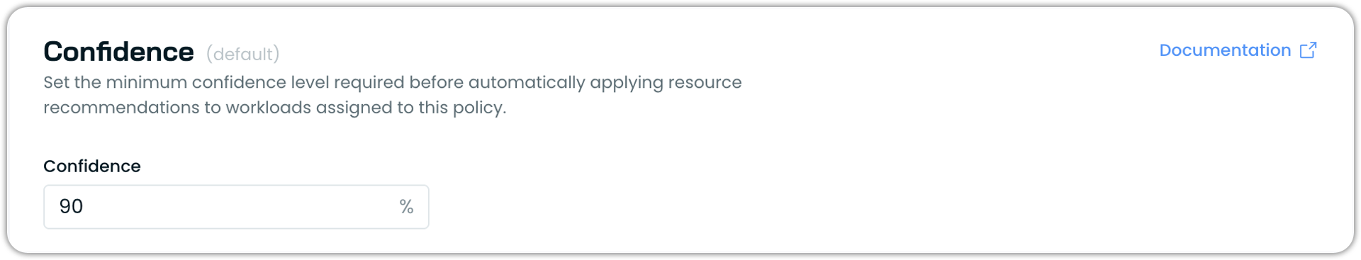 Scaling policies now include a configurable confidence threshold setting that determines the minimum confidence level required before automatically applying resource recommendations to workloads. This setting enables teams to strike a balance between optimization speed and recommendation reliability, tailored to their risk tolerance and workload characteristics.