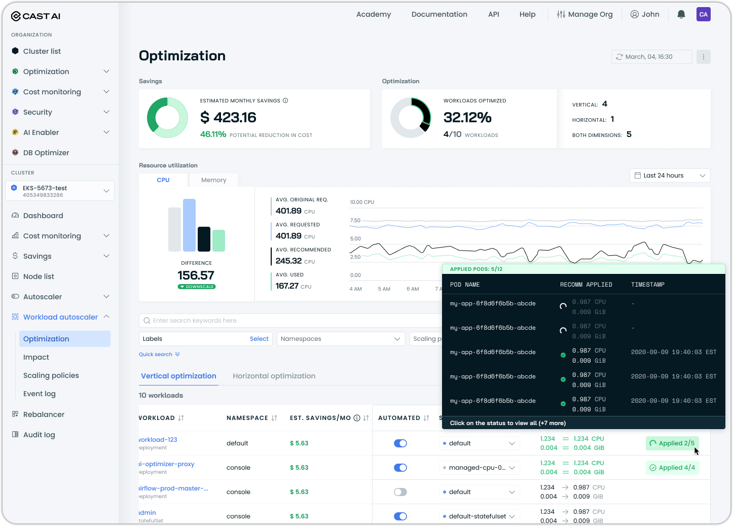 - Summary dashboard: Displays estimated monthly savings, CPU and memory differences, and optimization status at the top of the page
