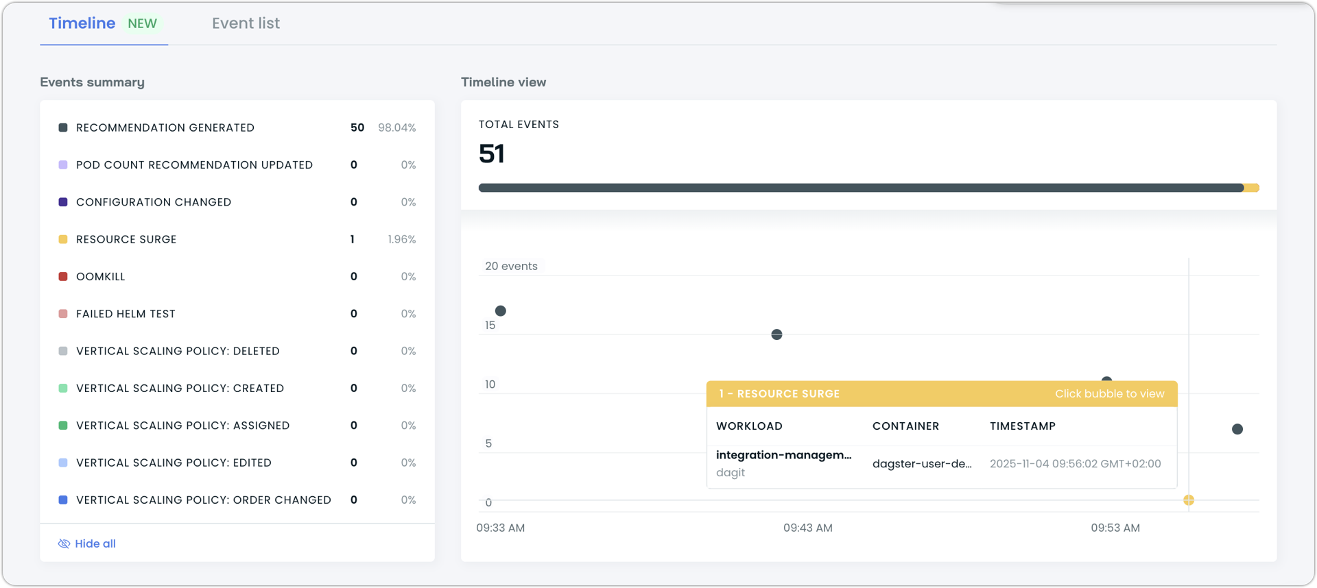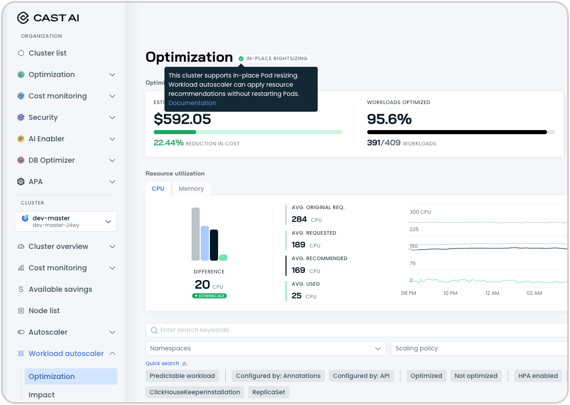 The Workload Autoscaler dashboard now displays an in-place rightsizing status indicator, indicating when Kubernetes in-place Pod resizing is active for workload optimization. This provides immediate visibility into whether recommendations are being applied through pod restarts or via in-place resize, helping teams understand the optimization method being used.