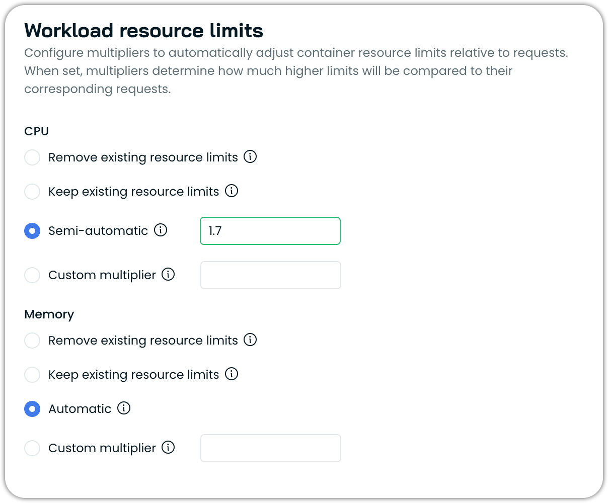 Workload Autoscaler now offers a semi-automatic CPU limit option that provides conditional limit management based on workload configuration. When enabled, this setting applies CPU limits as a multiple of requests only to workloads that already have CPU limits defined and where existing limits are lower than the calculated result. For workloads without existing limits or with higher limits, the configuration remains unchanged.