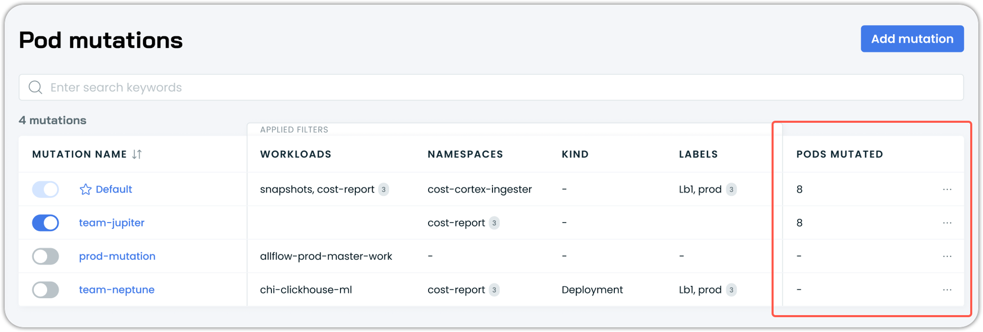 The Pod Mutations list now displays the number of pods affected by each mutation, providing immediate visibility into the reach and impact of each mutation.