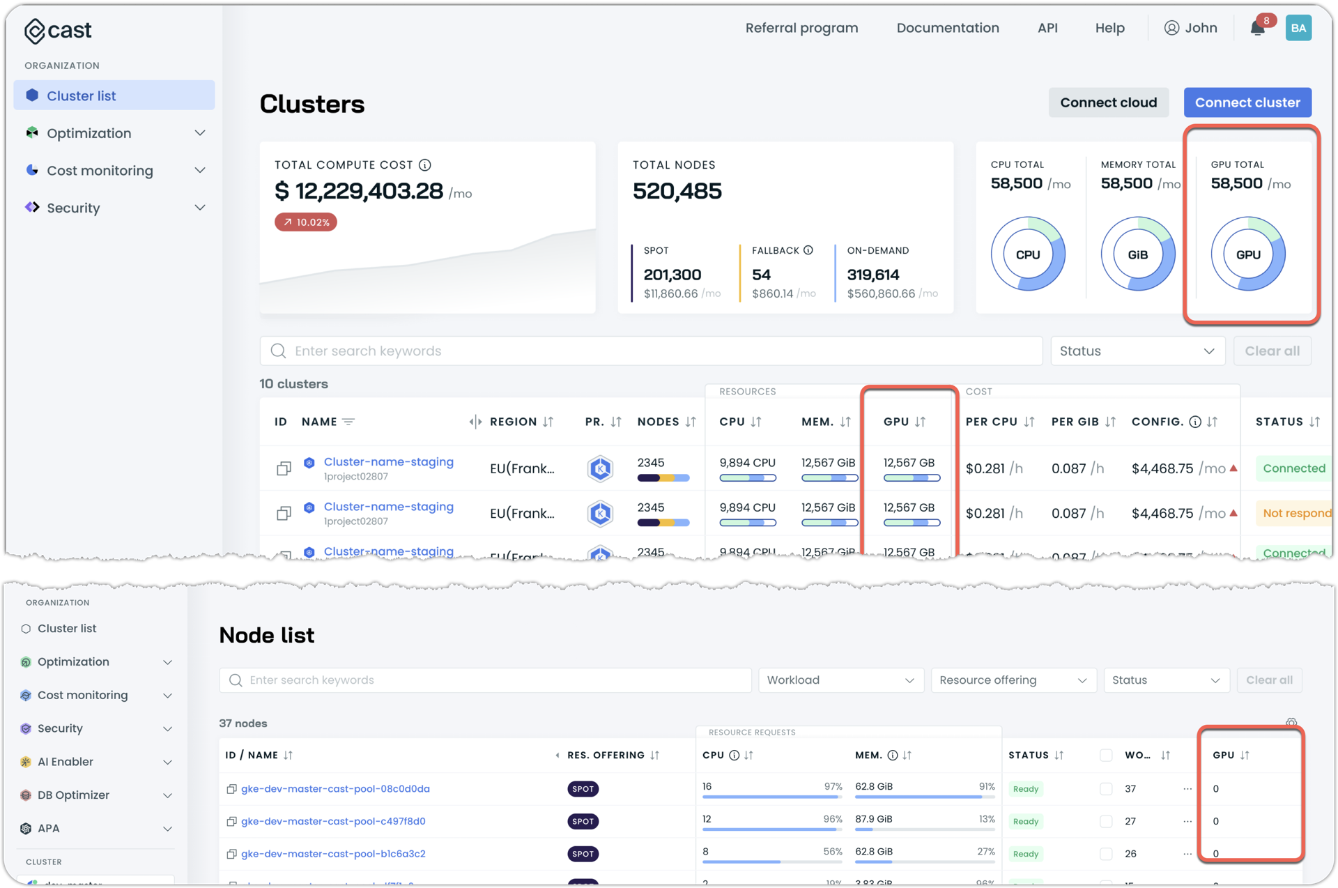 The cluster list now displays GPU information in both the summary widgets and as an optional column, while the node list offers the optional GPU column.