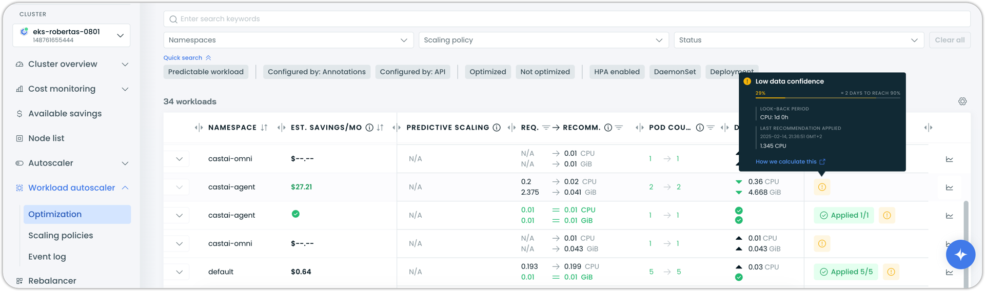 Workload Autoscaler recommendation cards now display detailed confidence information through expanded tooltips. When recommendations have low data confidence, tooltips show the current confidence percentage, the number of data points collected, the lookback period for each resource (CPU and memory), when the last recommendation was applied, and an estimated time to reach higher confidence levels.