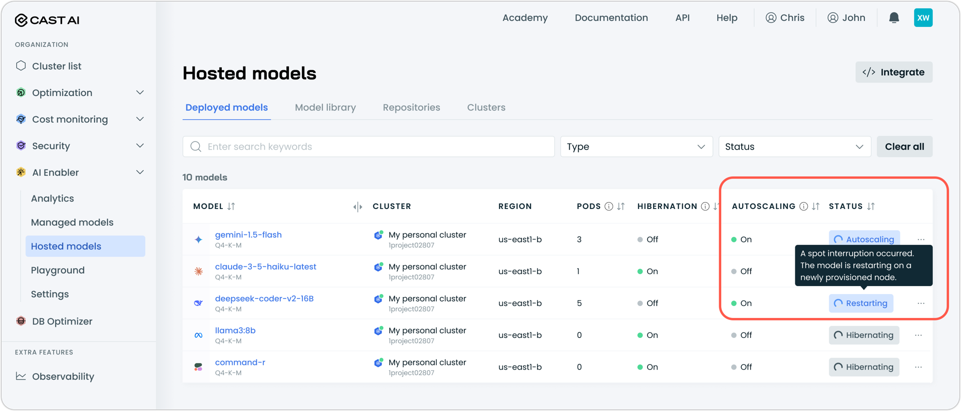 AI Enabler now displays Spot interruption events and status changes for hosted models. When a Spot interruption occurs, the model status updates to "Restarting" with an explanation that the model is restarting on a newly provisioned node. Spot interruption events also appear in the model's event log with timestamps, providing clear visibility into infrastructure changes affecting model availability.