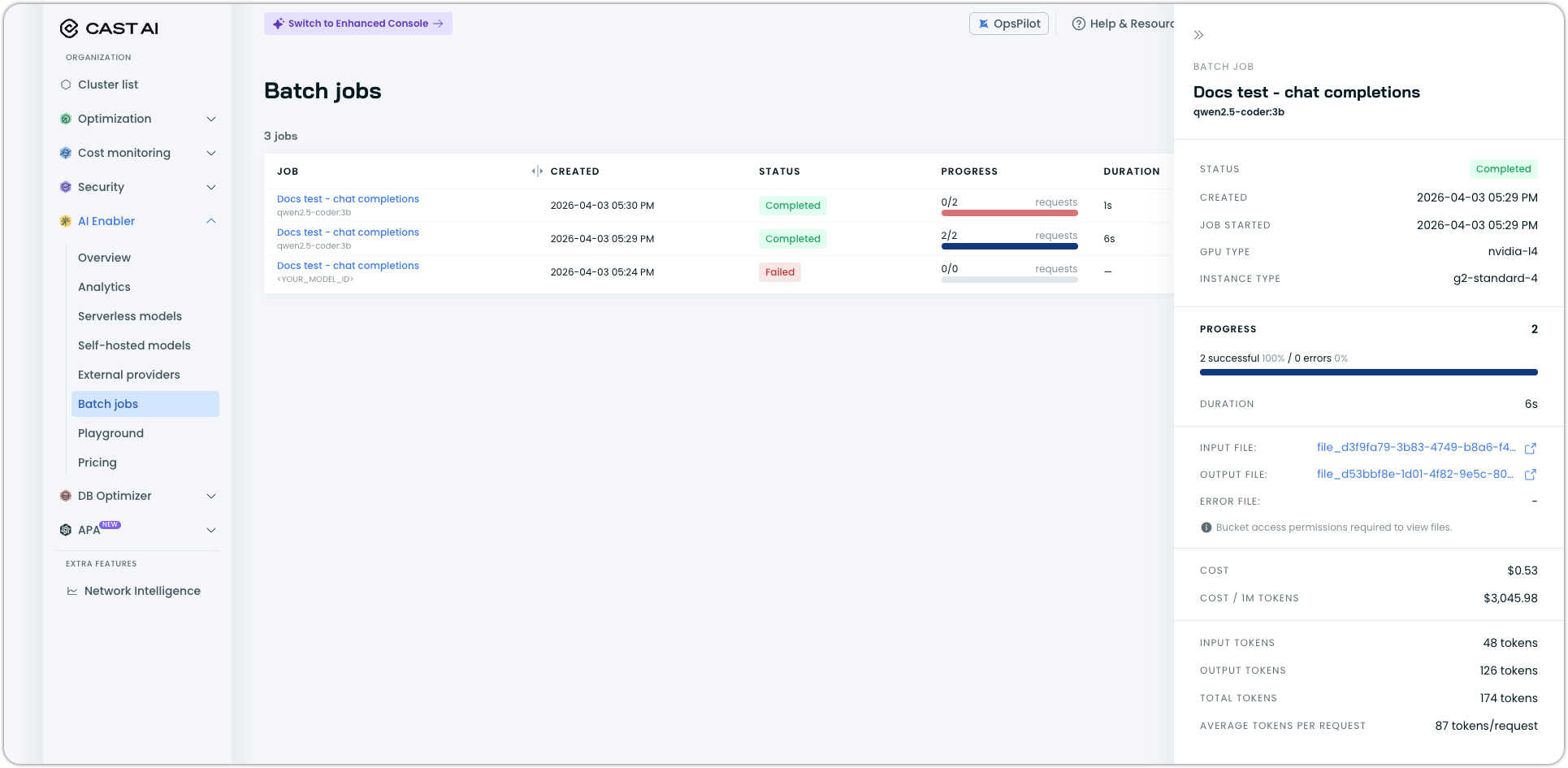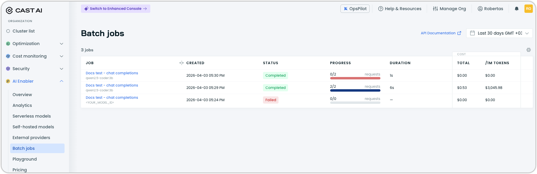 Navigate to AI Enabler > Batch jobs in the Cast AI console. The list view shows all batch jobs with their status, progress, duration, and cost.