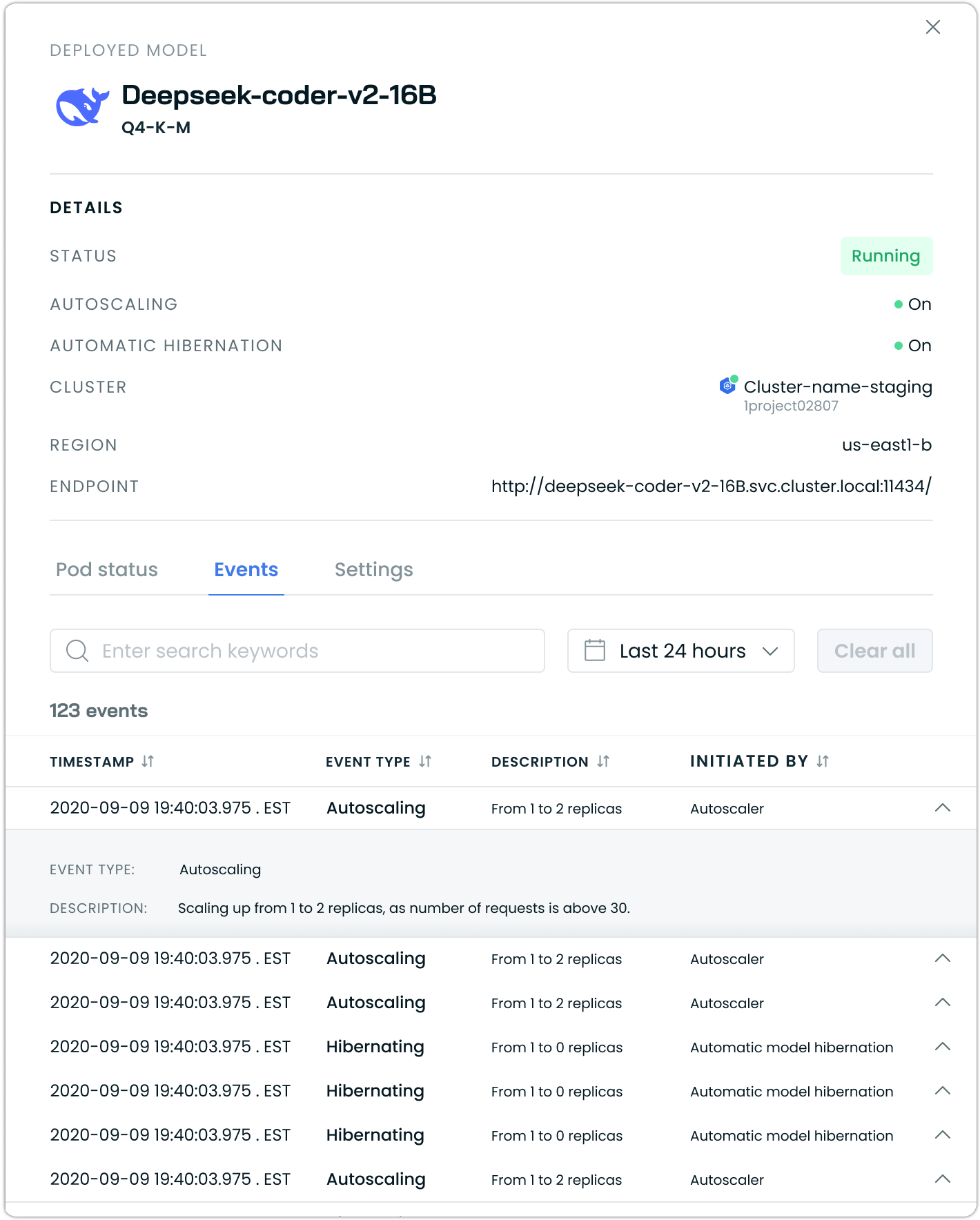 Each deployed model provides a detailed event history showing all autoscaling and hibernation activities. Navigate to a specific model and click the Events tab to view a chronological record of what happened.