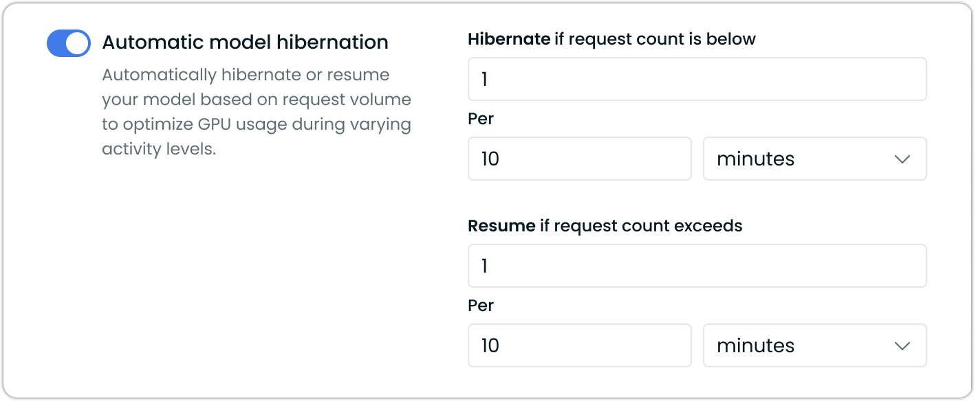 When a hibernated model receives requests, the system automatically begins wake-up while routing traffic to your configured fallback model. This ensures hibernation doesn't impact service availability.