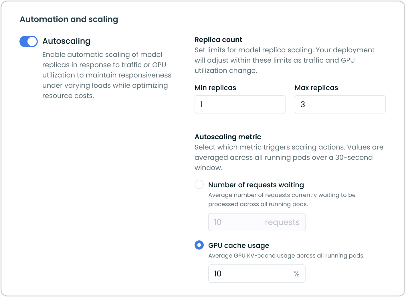 NoteAutoscaling is currently available only for vLLM-based model deployments. Ollama model deployments support hibernation and fallback features but not replica-based autoscaling.