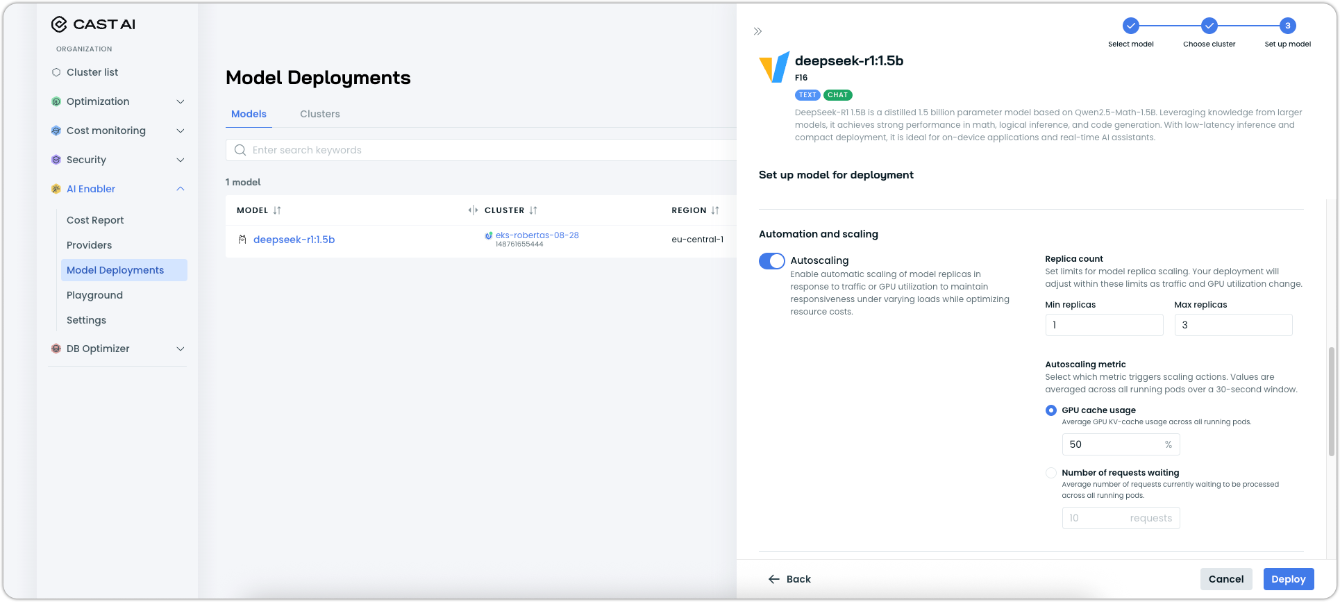 For new deployments, navigate to AI Enabler > Model Deployments and click Deploy model. The scaling options are in the Automation and scaling section of the deployment drawer.