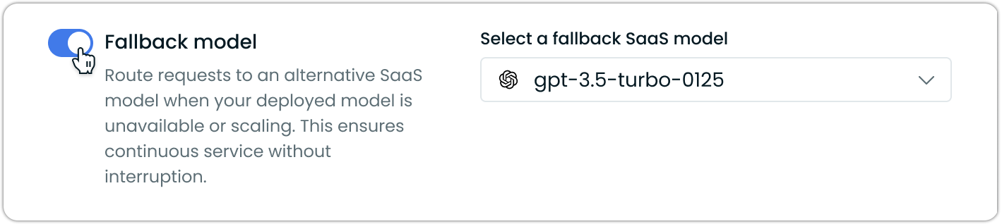 SaaS fallback models ensure service continuity when self-hosted models are hibernating, scaling, or otherwise unavailable. Configure external providers to handle requests during these periods.