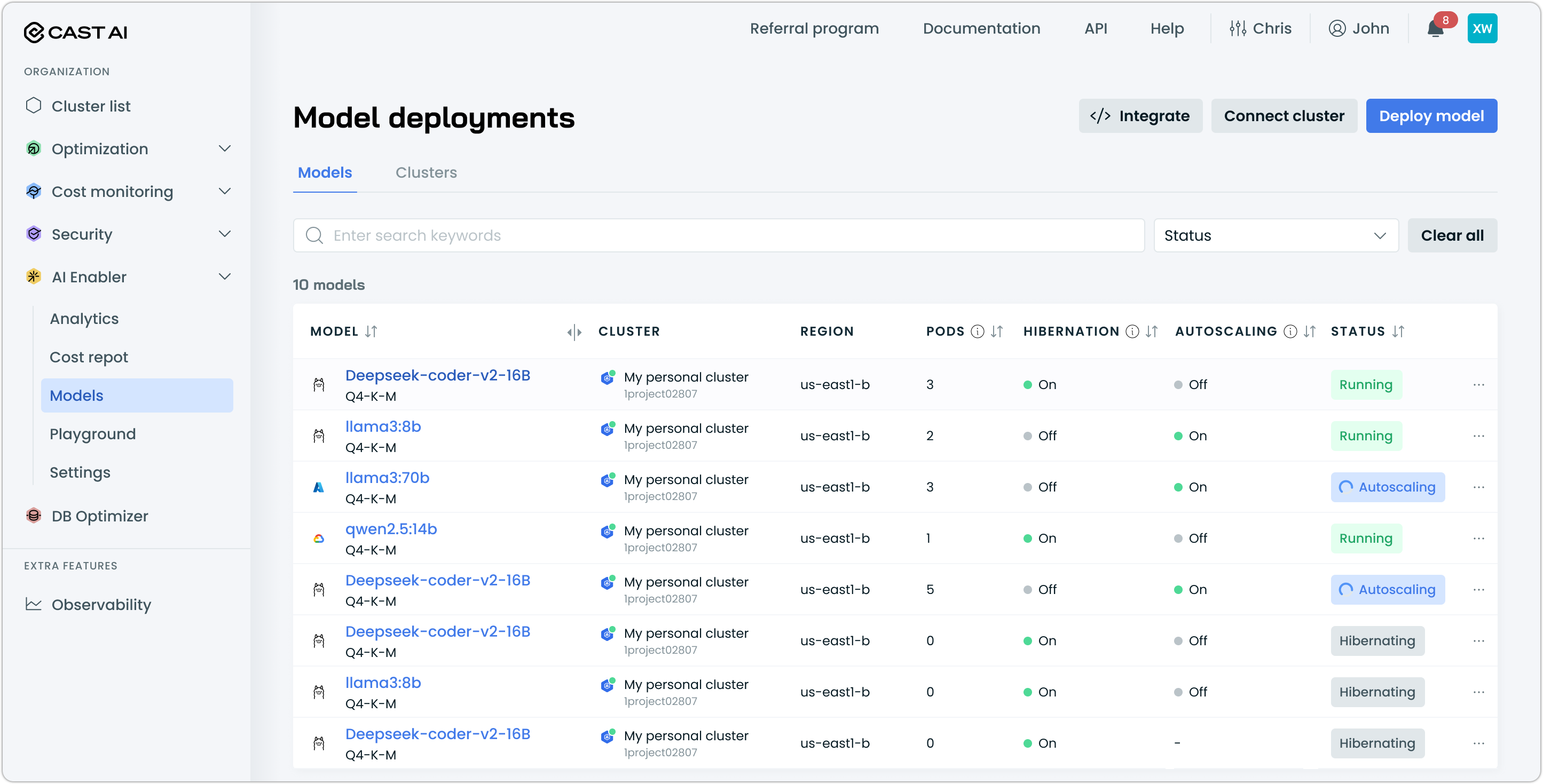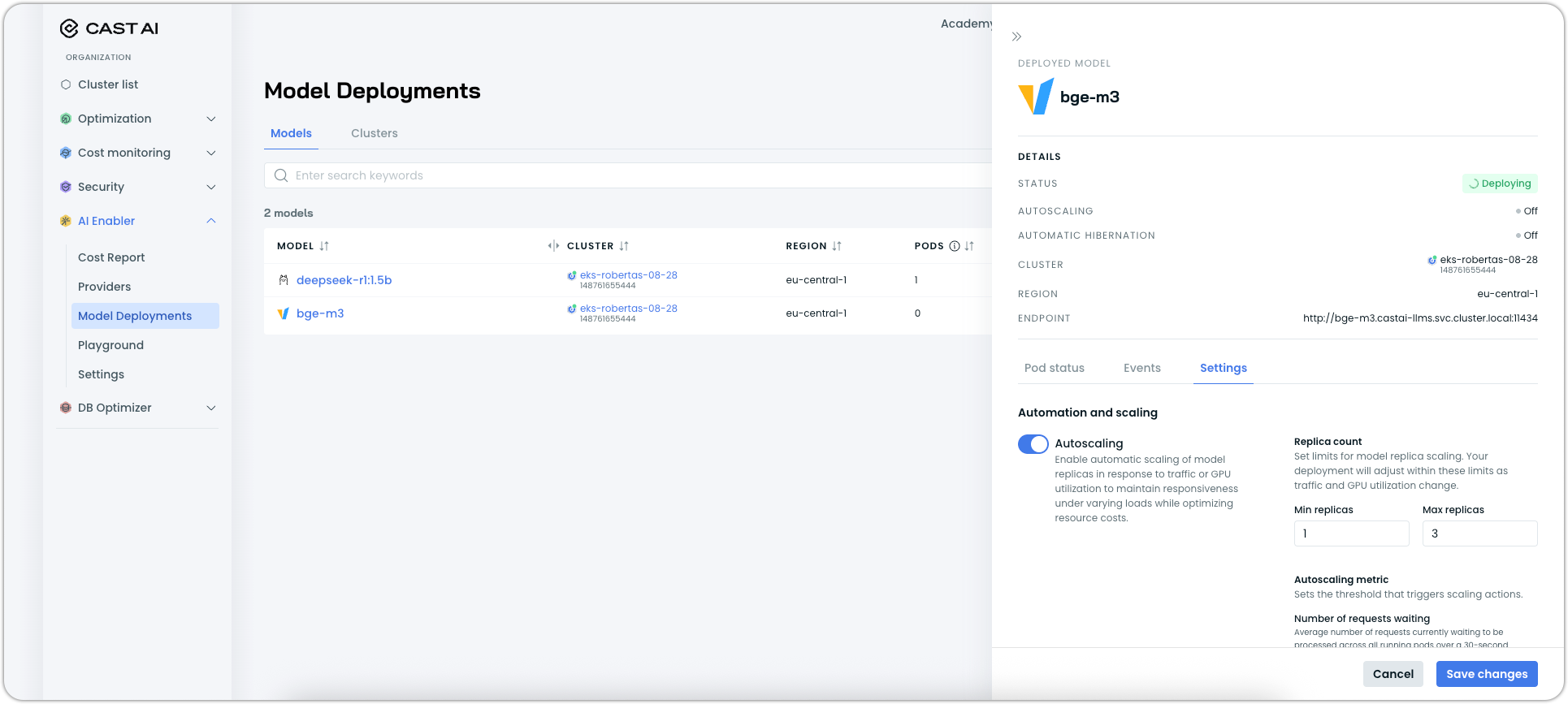 Cast AI's AI Enabler supports intelligent autoscaling for self-hosted model deployments. AI Enabler automatically manages capacity through model replica scaling, hibernation during idle periods, and seamless fallback to external SaaS providers when models are unavailable.