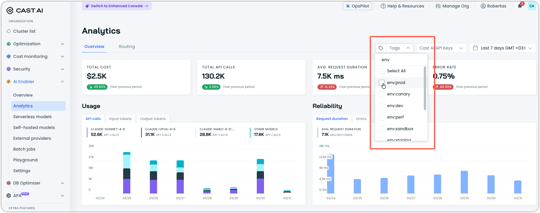 After you start sending tagged requests, use the Tags filter on the Analytics page to break down usage and cost data by tag.