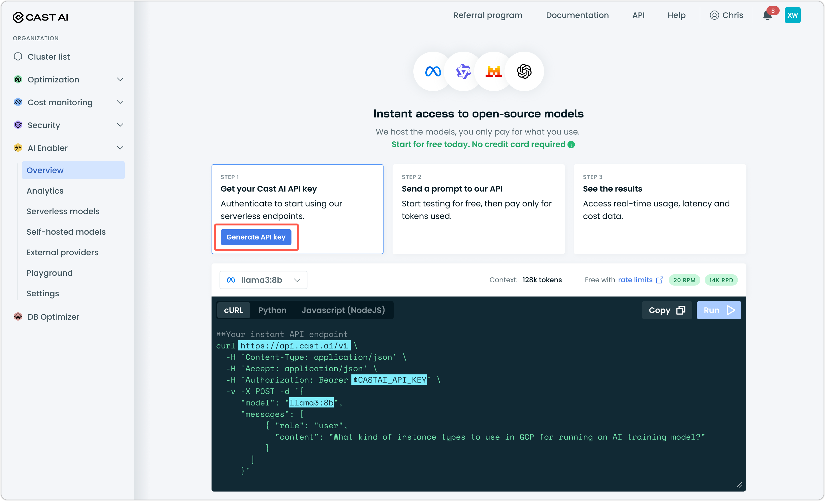 A Cast AI API key — Generate one from the Cast AI console under AI Enabler > Overview