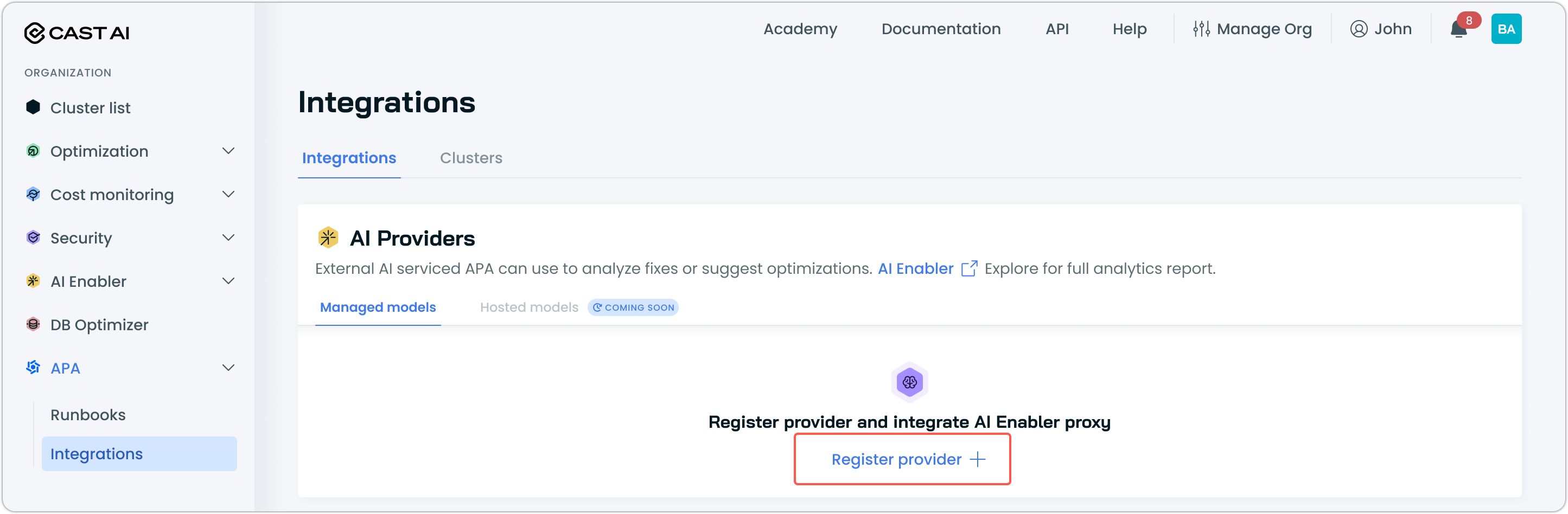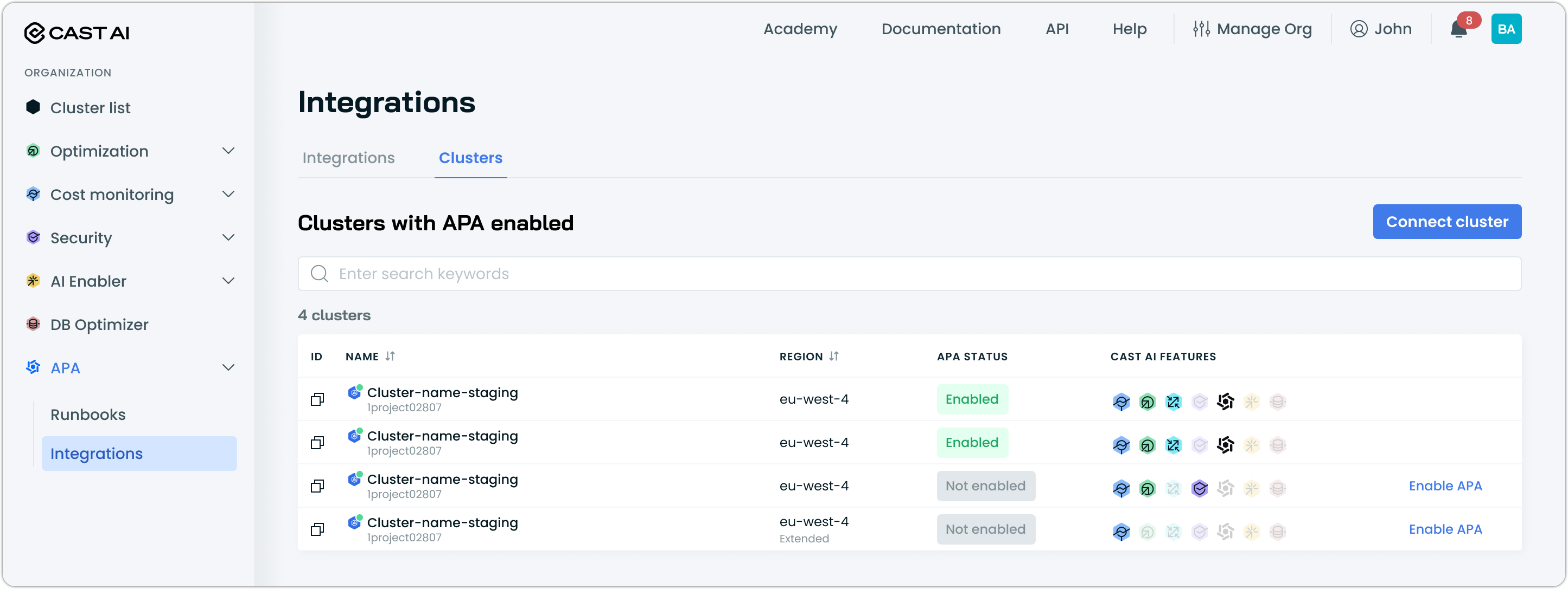 In the Cast AI console, navigate to APA > Integrations and select the Clusters tab.