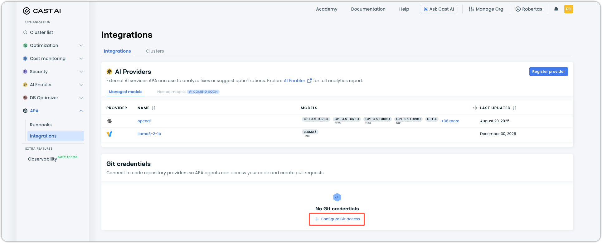 APA agents use AI models to analyze code and generate fixes. You must register at least one provider before configuring runbooks. Supported providers are OpenAI, Anthropic, and Google Gemini.