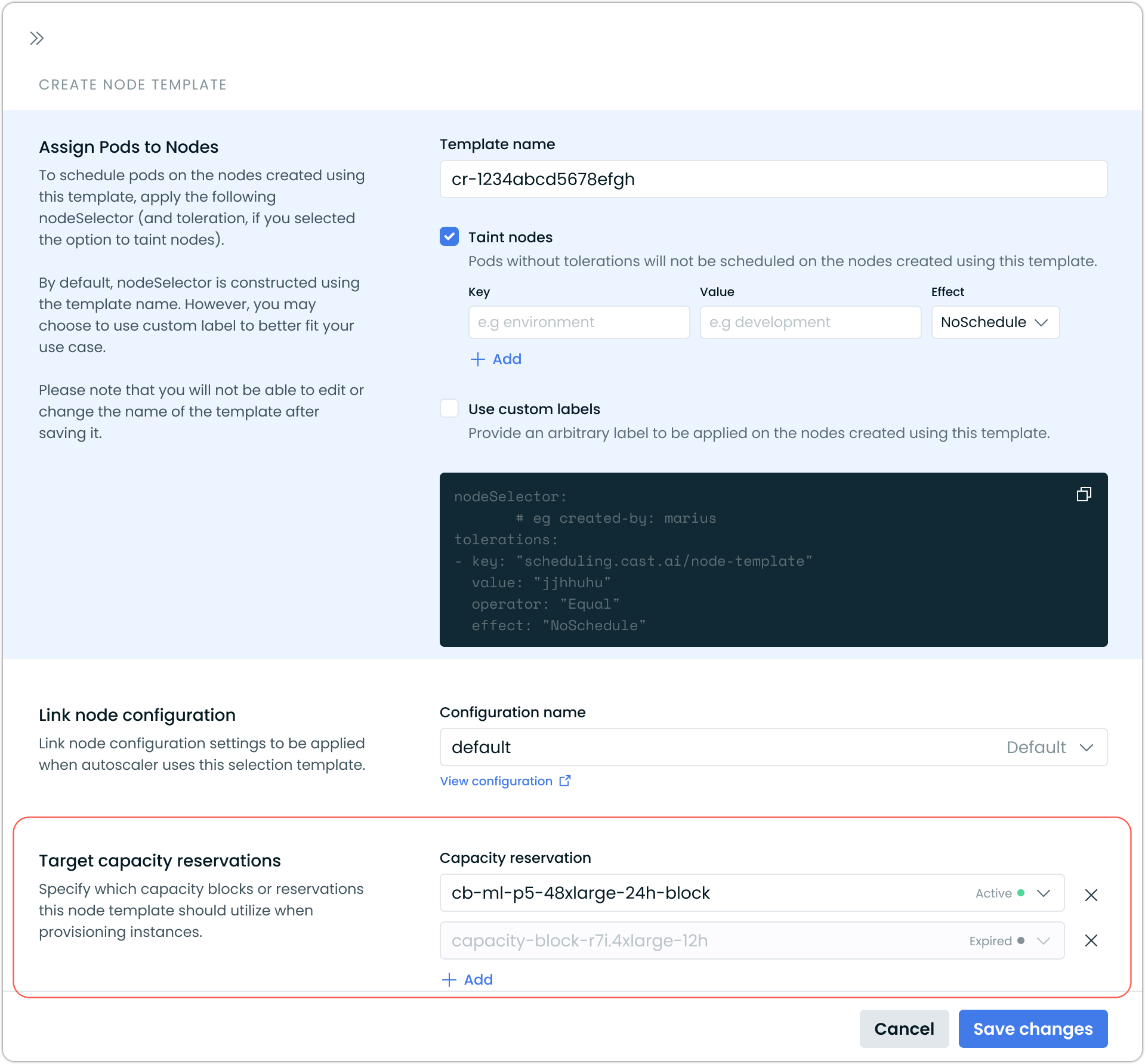 Configure the Node Template. Create or edit a Node Template and select the Capacity Block under Target capacity reservations. Cast AI locks the instance type and AZ to match the block. Add taints and tolerations to ensure only your ML workloads are scheduled on these nodes.