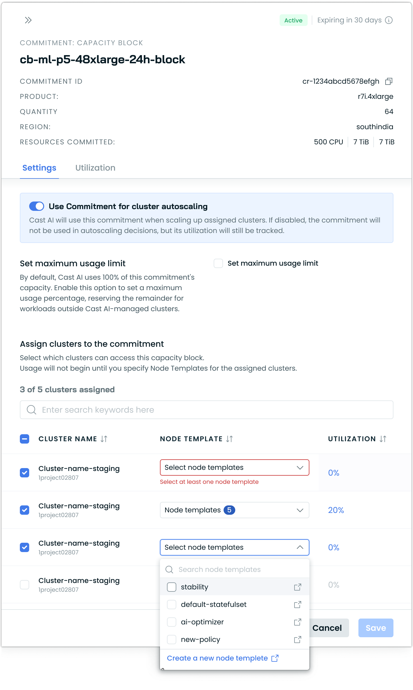 - For each assigned cluster, select at least one Node Template from the dropdown. This is a mandatory step. The autoscaler requires explicit Node Template targeting to use capacity reservations.