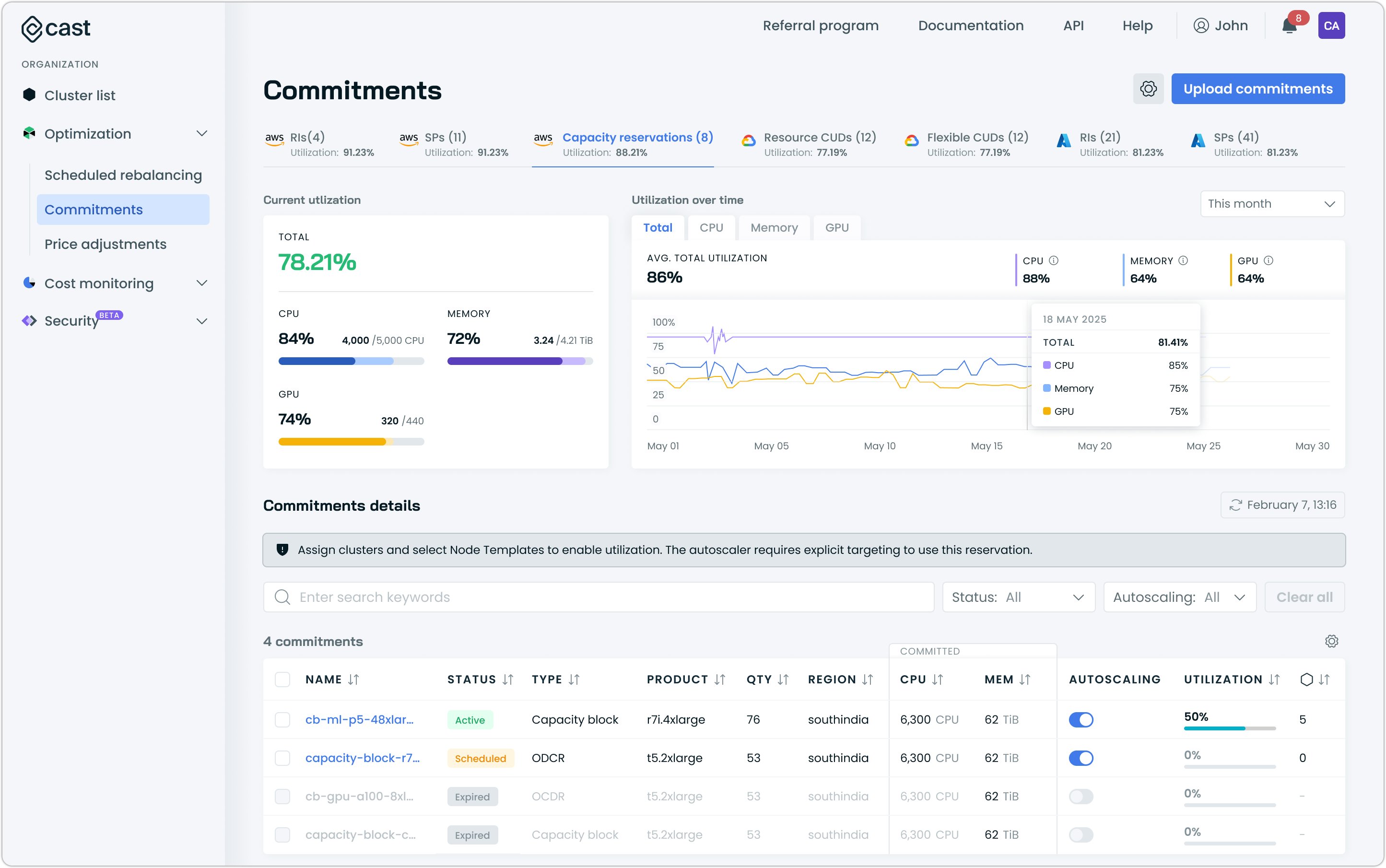 Cast AI treats capacity reservations as first-class commitments. Once imported, they appear on the Commitments page under the Capacity reservations tab, where you can assign them to clusters, track their utilization, and configure the autoscaler to provision nodes into reserved capacity.