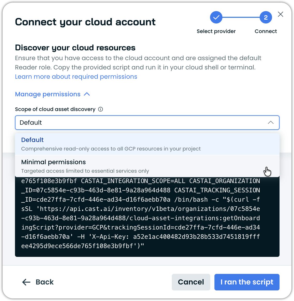 The onboarding script creates a dedicated GCP service account that Cast AI uses to request and manage GCP resources on your behalf.