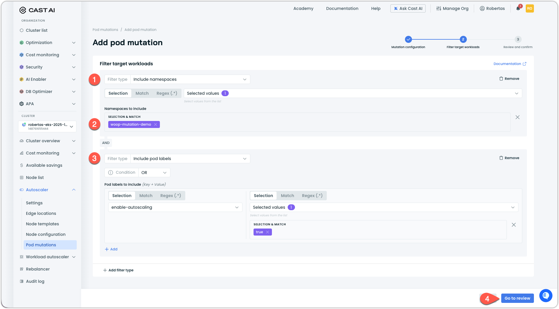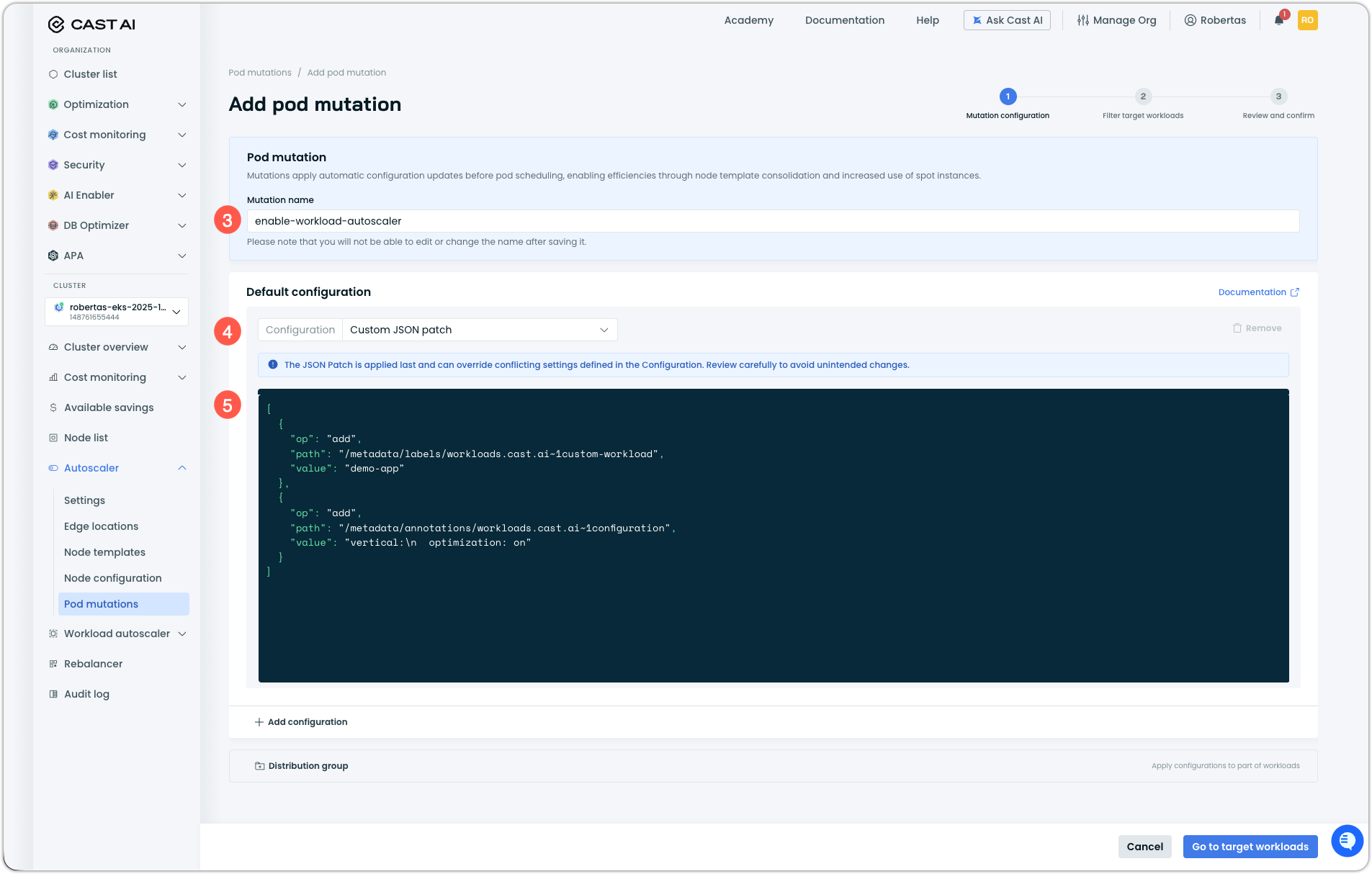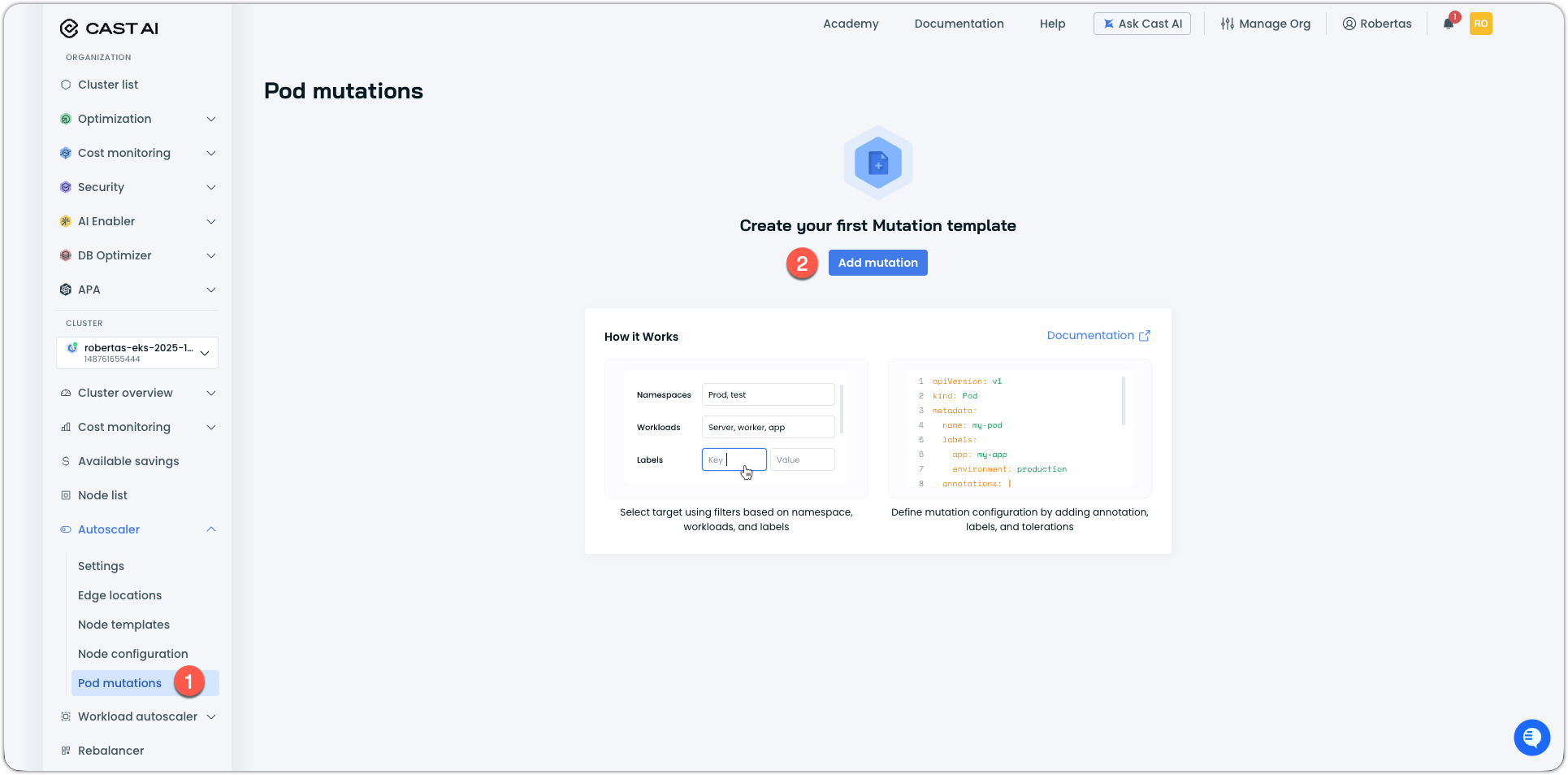 In the Cast AI console, navigate to Autoscaler → Pod mutations.