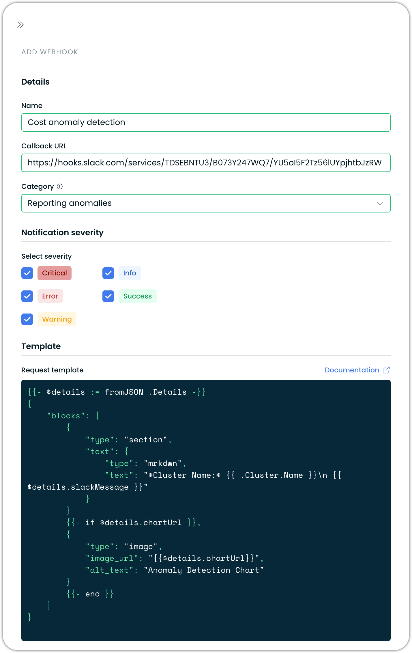 .Cluster.Name: The name of the cluster.Cluster.ID: The unique identifier of the cluster.Details: Contains all the anomaly-specific data$details.slackMessage: A formatted message about the anomaly$details.chartUrl: URL to a chart visualization (if available)