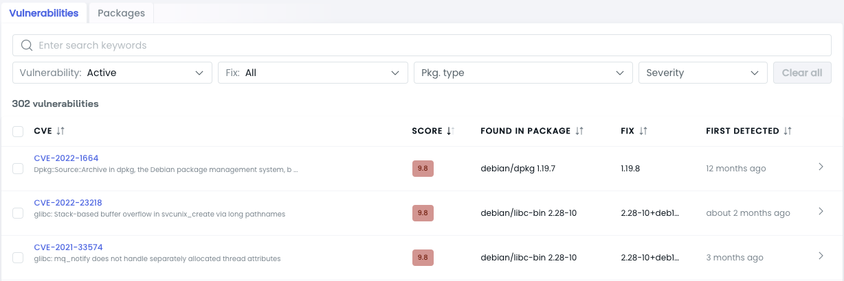 The Vulnerabilities tab lists all detected vulnerabilities in the selected image, along with available fixes. The vulnerabilities are sorted by their CVSS (Common Vulnerability Scoring System) score, highlighting the most critical issues.