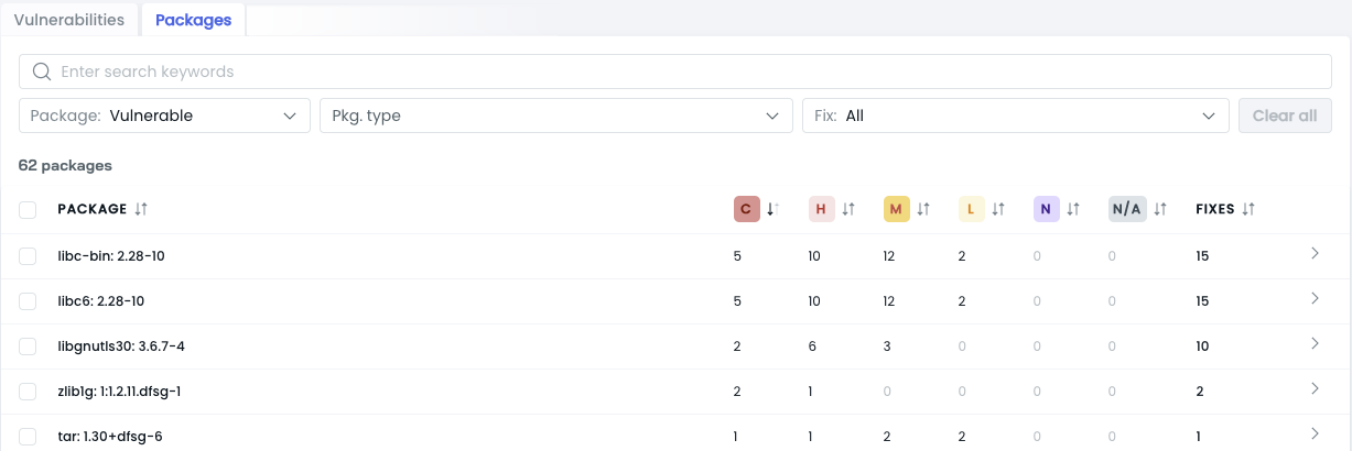 The Packages tab provides information about the operating system and application-specific packages present in the image. It identifies any vulnerabilities associated with these packages and suggests available fixes.