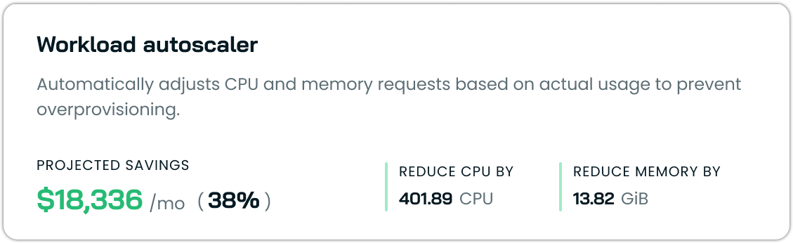 Workload Autoscaler continuously learns actual resource utilization and adjusts requests to match reality. This tighter fit enables better bin-packing and reduces the total compute capacity your cluster requires.