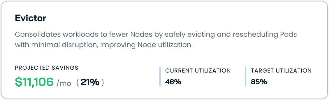 Cast AI's Evictor works with Karpenter's consolidation to improve Node utilization while minimizing workload disruption. Unlike standard eviction, this integration: