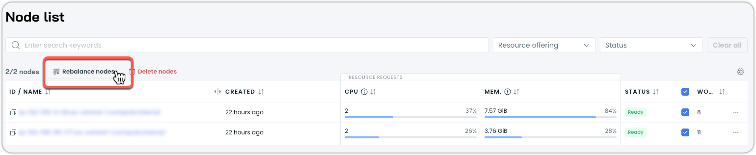 Or select specific nodes via Cluster > Node list > Select nodes > Rebalance nodes