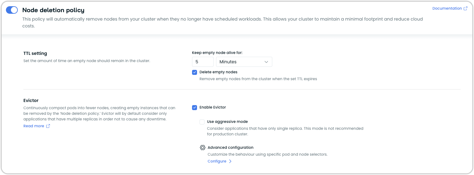 Enable Evictor (Node deletion policy must be enabled for Evictor to become available)