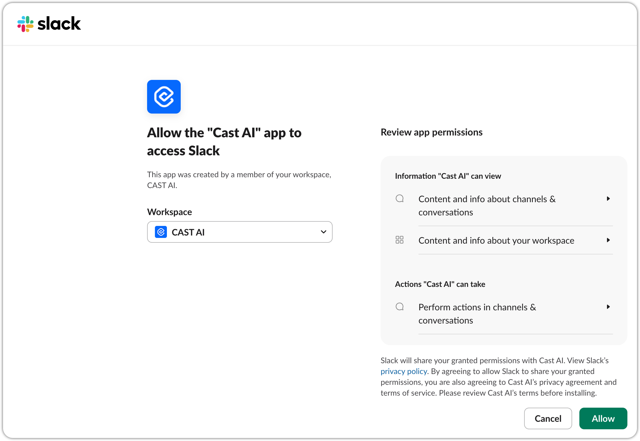 - Content and info about channels & conversations — Allows Cast AI to see which channels are available for posting notifications