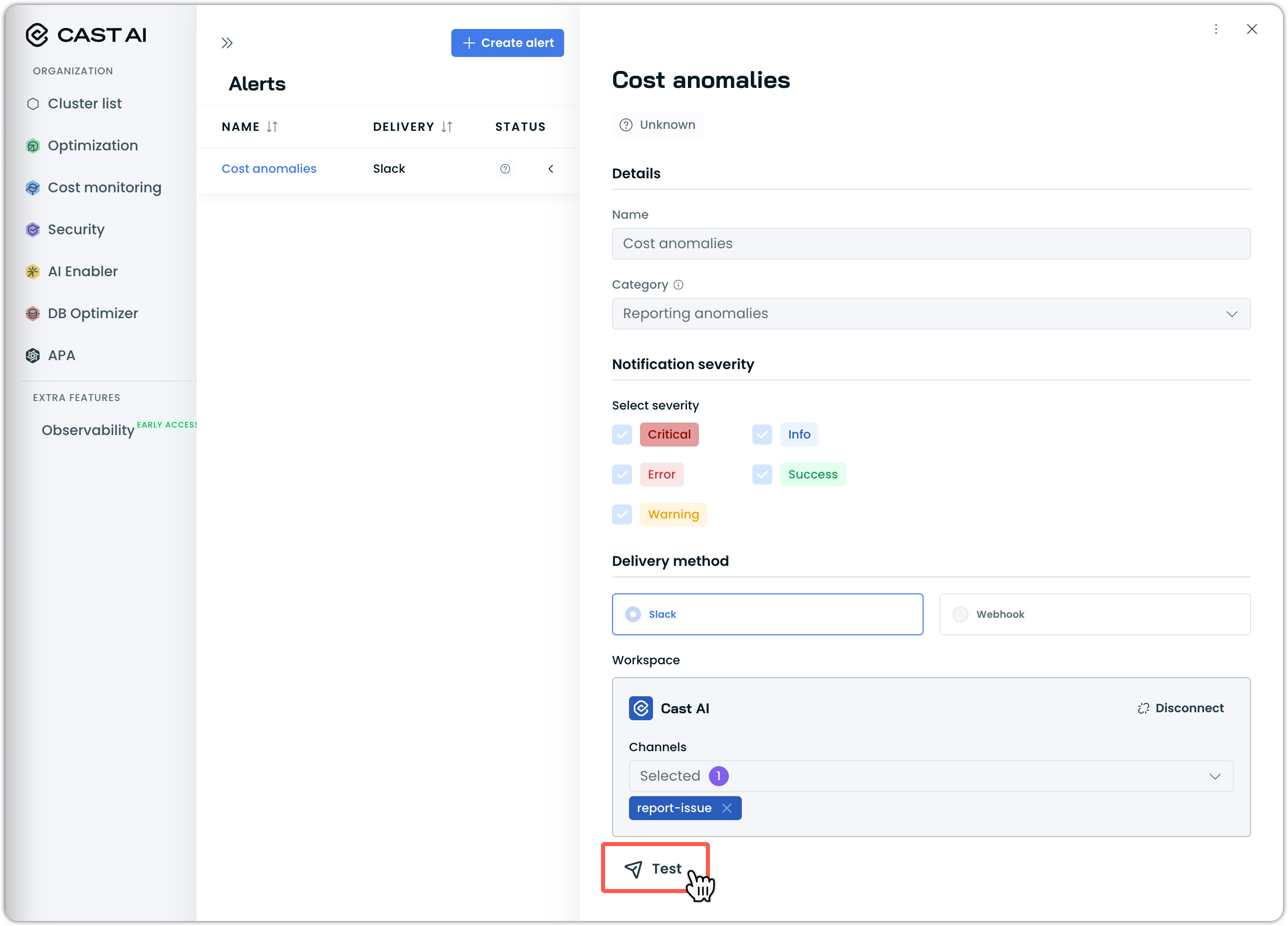 Cast AI sends a test notification to all configured Slack channels for this alert.