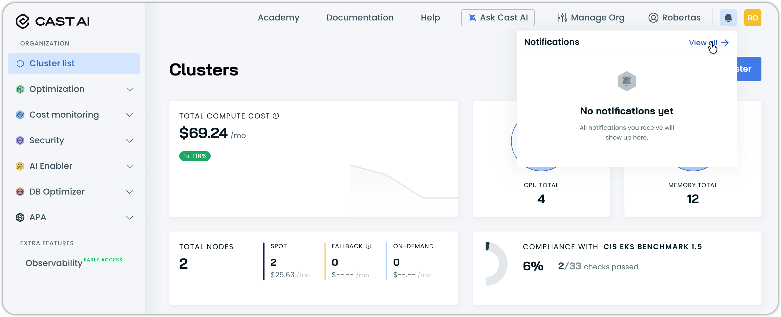In the Cast AI console, click the Notifications icon in the top navigation, then click View all.